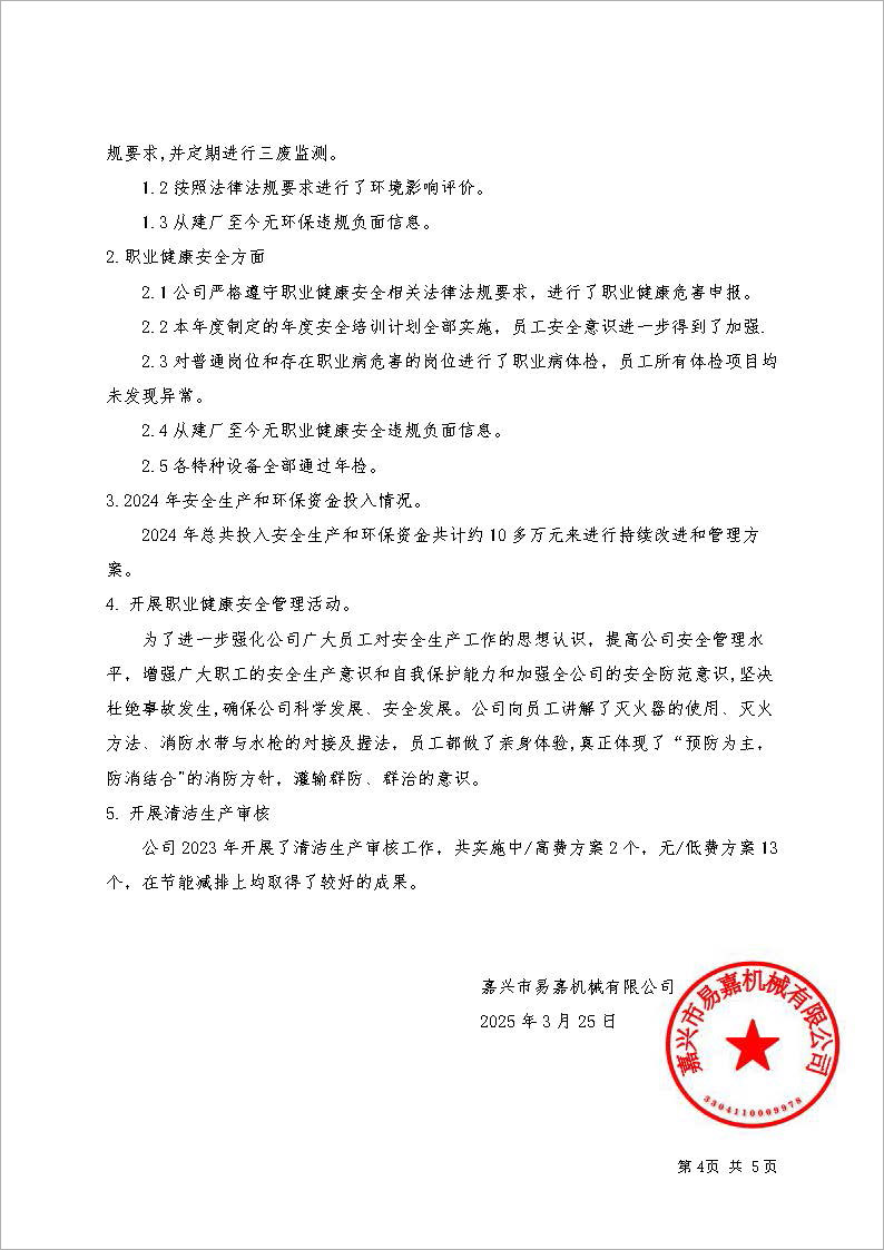 嘉興市易嘉機械有限公司2024年度綠色低碳發(fā)展年度報告